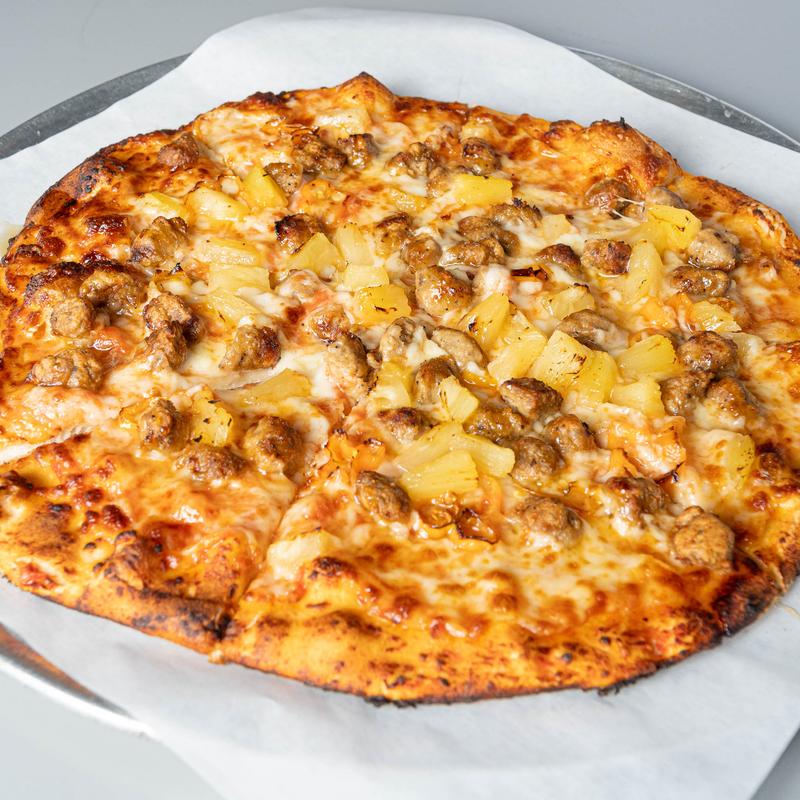 Habanero peppers, pineapple, spicy Italian sausage with a hot honey drizzle