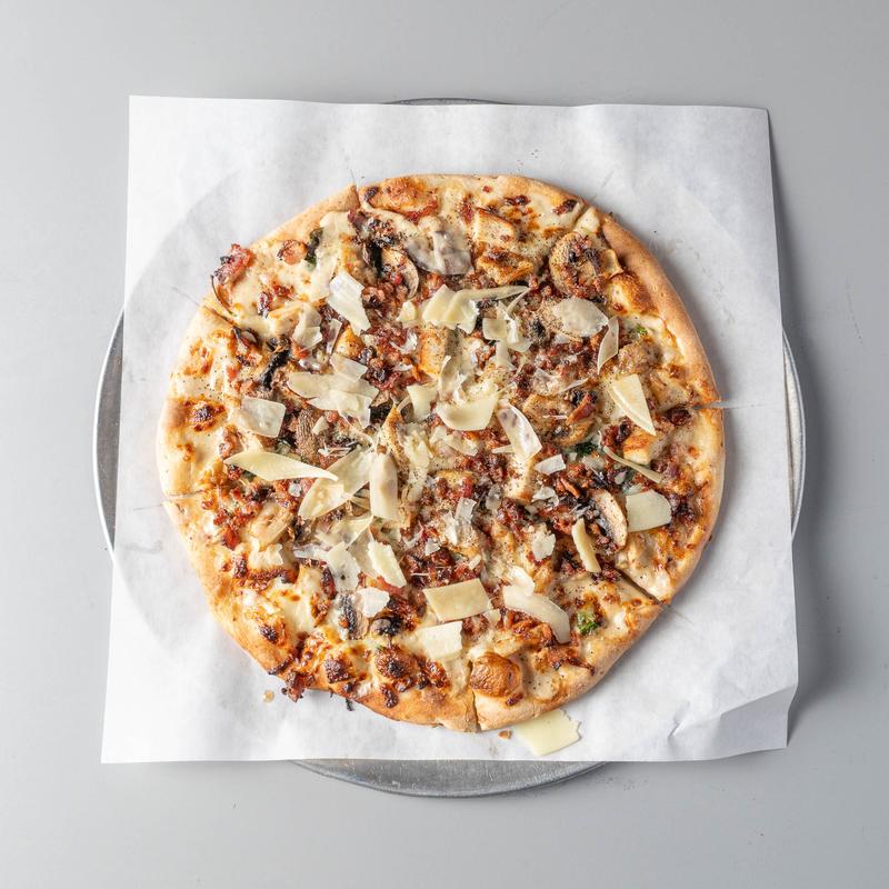 Alfredo sauce, chicken, bacon, mushroom, spinach, & cracked pepper