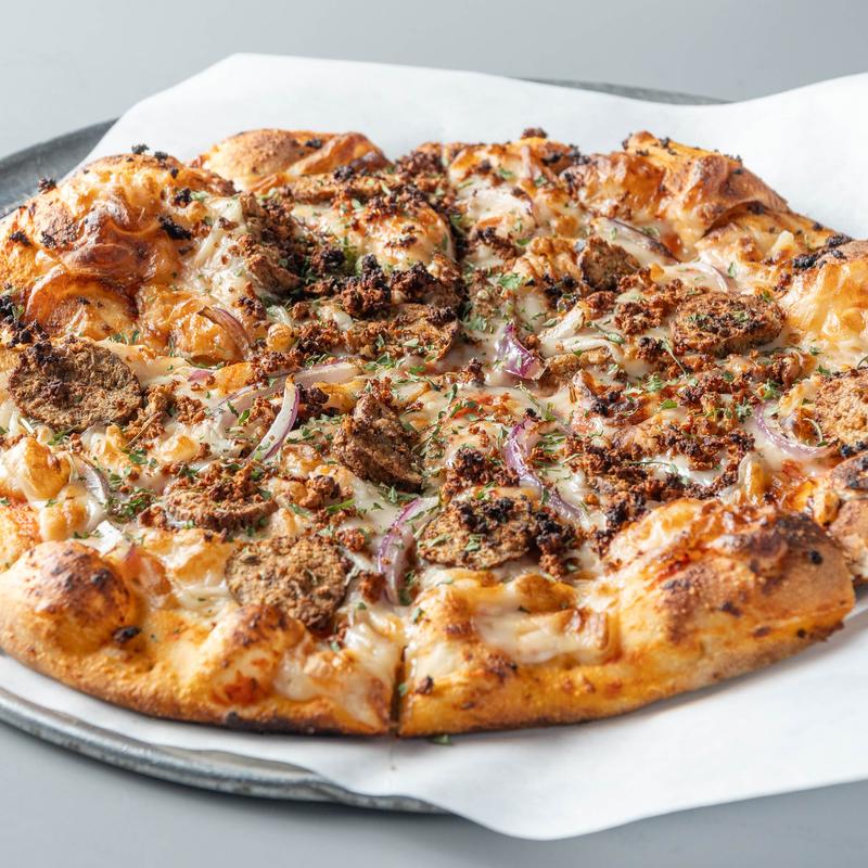 All vegan meatballs, sausage, red onion, & vegan cheese